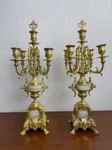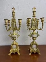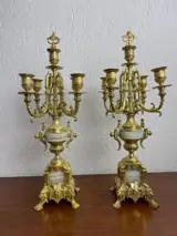 Koppel fraaie, bewerkte bronzen kandelaars met ruimte voor vijf kaarsen op mooi bewerkte voet. Met mooie warme patina. Kandelaren zijn voorzien van dover in centrale bobeche.