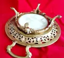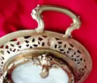 Middenstuk in marmer en brons met een basis ondersteund door vier klauwvormige poten die een mythologisch dier voorstellen, het midden van brons met plantaardige decoratie en zes bustes van engeltjes.