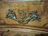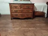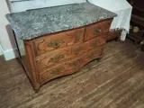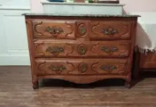 Regency-ladekast in fruithout (licht walnoot). Blad in grijs Sainte Anne-marmer versierd met Corbin-snavel. 4 laden begrensd door dwarsbalken. Bronzen handgrepen en sloten. twee sleutels Retoucheren gedaan. Gaten om op te merken aan de uiteinden van sommige lades. Goede algemene staat voor de leeftijd.