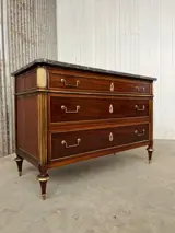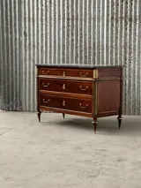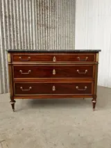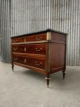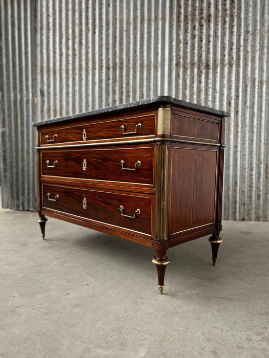 Mahonie commode, 3 laden kast. Louis XVI, met een overvloed aan vuur verguld messing beslag, lijstwerk en verfraaiingen.