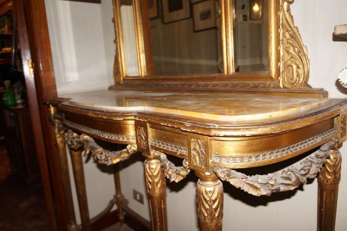 Console met marmeren blad en Lodewijk XV-stijl vergulde houten spiegel, enkele ouderdomssporen op de spiegel en een streep op het marmer.Afmetingen: 278(h)x 130x44 cm