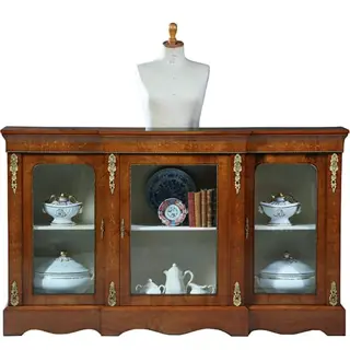 Engelse ingelegde credenza in notenhout met wildnoten en brons beslag en lijsten. Het front springt met de middelste deur een stukje naar voren, het bovenblad volgt die lijn. De zijdeuren met ronde bovenhoeken, de middelste deur met rechte hoeken. Stijlen met bescheiden florale motieven en het fries met een meer uitbundige guirlande.
