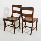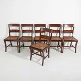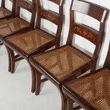 6 stoelen in de stijl D. Maria I. Mahonie, meidoorn en andere houtsoorten, florale decoratie ingelegd in meidoorn, trapeziumvormige rieten zittingen, licht gebogen poten. Portugees, 20e eeuw. Afmetingen: 86,5x45x46,5cm. In goede staat.