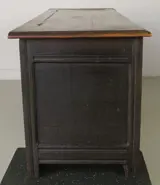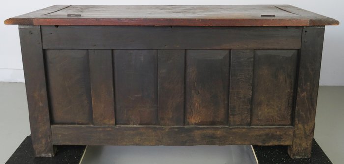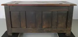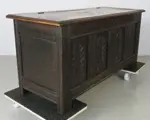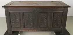 Deze dekenkist heeft fraai floraal snijwerk op het front en een zinken bak in het interieur van latere datum.