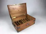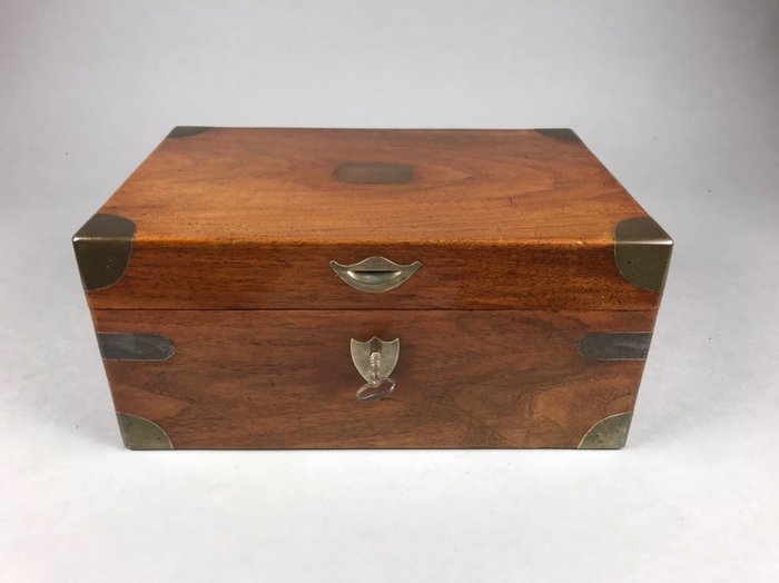 Zwaar uitgevoerde massief mahoniehouten documentenkist met messing beslag. Het interieur met diverse vakken en in het deksel een scharnierend paneel met geheim slot. Te openen door het rechter palletje van het slot in het deksel naar boven te drukken. Inclusief sleutel.