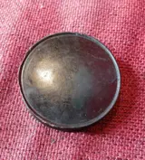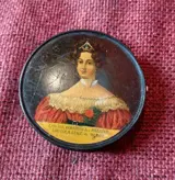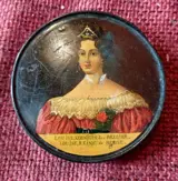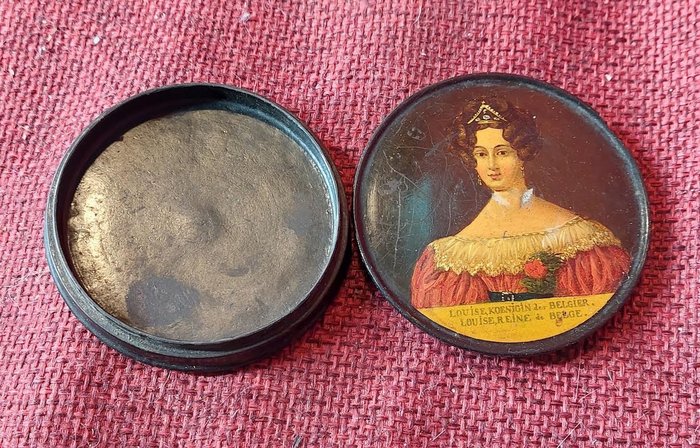 doos, misschien een snuifdoos, met een miniatuur van Louise Koningin van België, in gezwart hout, defecten aan de rand, de beschildering is intact op twee defecten aan de hals na, diameter 9 cm