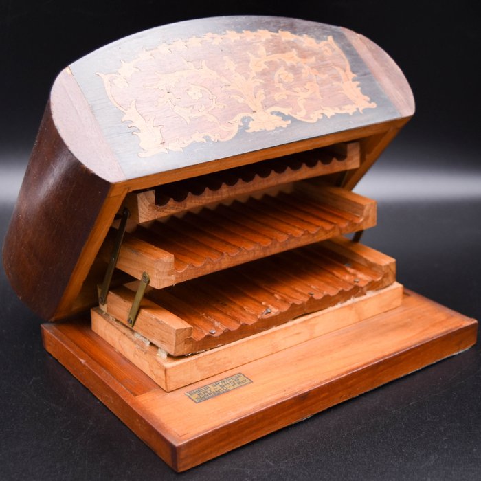 Oude sorrentodoos / sigarettenkoker met houtinleg en sierdetails in twee tinten.