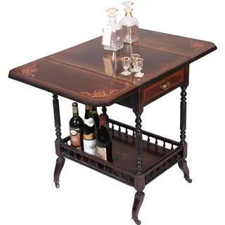 Thee- of dranktafeltje met twee afhangende bladen waarmee het oppervlak van de tafel bijna verdubbeld kan worden. Onder het blad een lade voor theezeef of kurkentrekker en daaronder een blad met rekje waarachter het theeservies of de drankflessen veilig staan wanneer de tafel een stukje verreden moet worden.