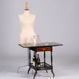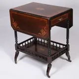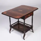 Thee- of dranktafeltje met twee afhangende bladen waarmee het oppervlak van de tafel bijna verdubbeld kan worden. Onder het blad een lade voor theezeef of kurkentrekker en daaronder een blad met rekje waarachter het theeservies of de drankflessen veilig staan wanneer de tafel een stukje verreden moet worden.