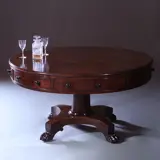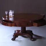 Engelse vroeg 19 e eeuwse Georgian drumtable in mahonie, in het blad vier laden en daartussen 4 schijnladenfronten. Het geheel op een gedraaide kolom, staand op een plat viersprant waaronder vier klauwpoten met daarin onzichtbaar gemonteerde wielen.