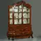 Hollandse 18 e eeuwse porseleinkast in wortelnoten, dubbel gebogen onderkast met een meervoudig gewelfde kap. Ingelegd met citroenhout. Staand op gesneden klauwpoten, een klein schortje met een ingelegd schelpmotief. De beglaasde zijkanten lopen schuin uit net als de onderkast. De laden met vergulde bronzen ladentrekkers. In de vitrine 4 schappen, de drie planken daarvan met gecontourneerde randen. Alle schappen met gleuven om een kostbare collectie schotels prachtig te kunnen presenteren.