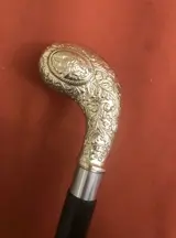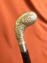 Een "golf" stijlvolle wandelstok in Art Nouveau-stijl. Handvat uitgevoerd als golfstick, uitgevoerd in verzilverd messing. De houten stok is in twee delen afneembaar , gemakkelijk mee te nemen . Uitstekende staat. Lengte: 97 cm