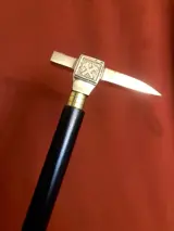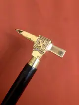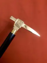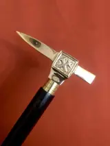 Een, zelfverdediging, ongebruikelijke wandelstok. Handvat uitgevoerd als een overweldigende piolet in verzilverd brons. De houten stok is in twee delen afneembaar , gemakkelijk mee te nemen . Uitstekende staat. Lengte: 92 cm