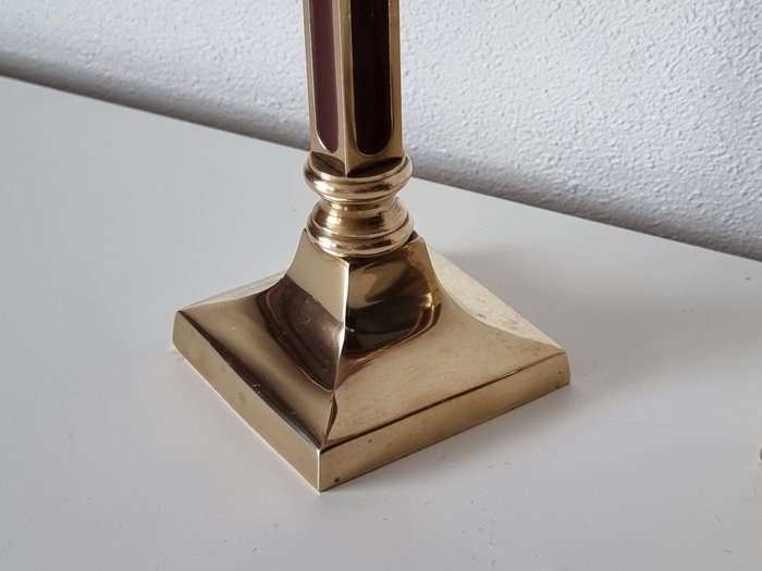 Stijlvolle elegante kolomvormige kandelaars van brons met rood emaille in de kolom verwerkt.