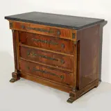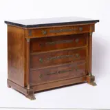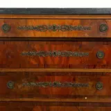 Ladekast in Empire-stijl. Gefineerd in mahonie en andere houtsoorten, met vier grote lades, applicaties en poten in geel metaal, marmeren blad. Afmetingen: 88x113x60 cm.