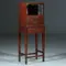 Eikenhouten kistkastje met handgreep, in de ondertafel een kleine lade en in het kistje twee kleine laden, bronzen ladentrekkers, en strakke iets tapslopende pootjes met een in hoogte verspringend sport verbinding.