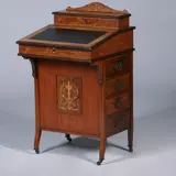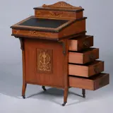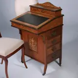 Engelse notenhouten Davenport met subtiel inlegwerk, qua stijl tussen late-Victorian en Edwardian in is strak van model op hogere elegante pootjes, net even amders dan gebruikelijk. Onder de schrijfklep een kleine laden en postvakjes, de bovenzijde kan opengeklapt worden, verschillende postvakjes, kaartvakjes een inktpot en postzegelvakjes komen dan binnen handbereik. Aan de rechtse kant vier laden en links vier schijn laden. Compleet met alle bronzen ladentrekkers (een staat er niet op foto, die is er wel bij, de originele)