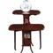 Sutherland table met twee niveaus, afgeronde hoeken en een ajour gezaagd middenpaneel in zowel de bovenste als de onderste laag. De onderste hangoorbladen laten zich elk met een uitzwenkbaar pootje ondersteunen. De oren van de boventafel hebben kleine sloofjes die uitgedraaid kunnen worden. Langs de bladrand een contrasterende bies in satijhout.
