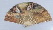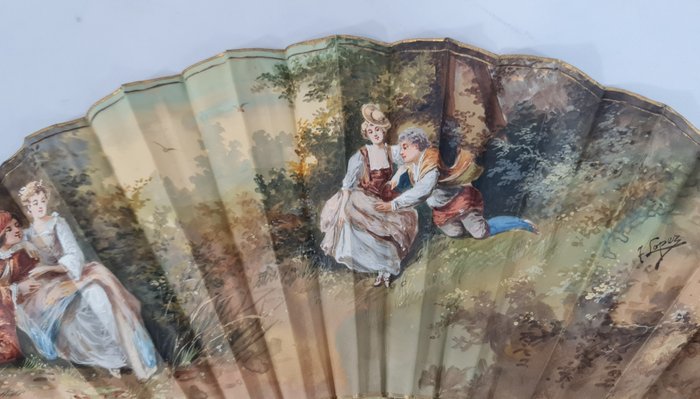 Het papieren blad is dubbelzijdig met de hand beschilderd met afbeeldingen van verkeringstaferelen en landschap. Gesigneerd F. López