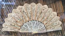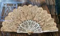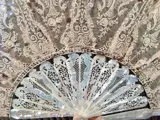 De vleugel van de waaier is in antieke kant, gemonteerd op hout. Meet ongeveer 14cm.