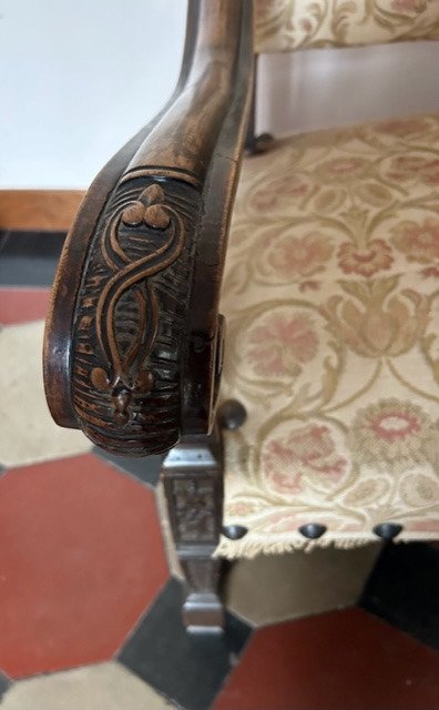 Gestoffeerde zitting en rugleuning, bekleed met originele antieke damaststof. Golvende en gebeeldhouwde armleuningen met gekrulde uiteinden.