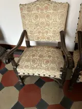 Stoelen met structuur in donker massief notenhout, gedecoreerd met houtsnijwerk.