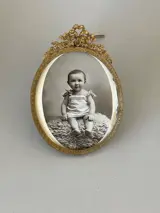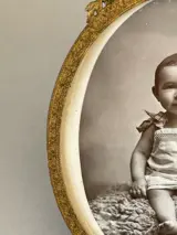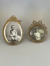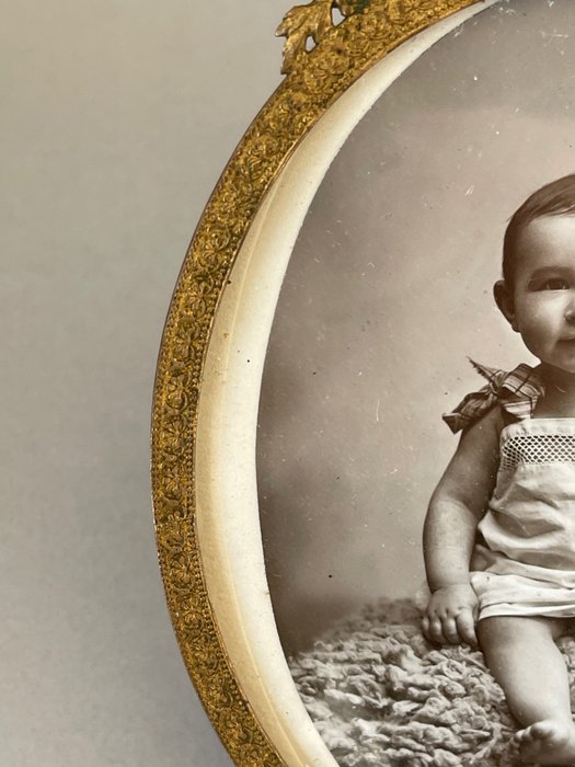 Twee prachtige fotodeuren gedecoreerd met Lodewijk 16 rond 1900 of zelfs 1890? , de eerste met babyzitje hoogte / 15 cm breedte / 10 cm (fotoruimte 11 cm hoog, 9 cm breed) goede staat, compleet, let op kleine krasjes op het glas links (kan verborgen zijn door een verleden overal in karton) . De tweede (meisje met een tennisracket) in brons, dubbel gebeitelde bronzen band en opengewerkt, compleet origineel geslepen glas van hoogwaardige afwerking, hoogte/11 breedte 10 cm (fotoruimte diameter 7 cm. De foto's dienen als beschrijving zorgvuldige verpakking