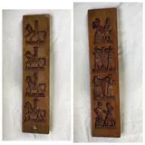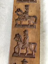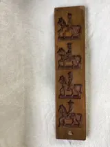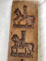 Wat u ziet op onze foto's is een fraaie Hollandse dubbelgesneden speculaasplank met daarin acht voorstellingen: de ene zijde vier verschillende ruiters te paard met verschillende hoofddeksels; de andere zijde zien we een dansend boerenechtpaar, een man en een vrouw met een harp, de Bijbelse verspieders met een grote druiventros en een man en vrouw, die aan het vioolspelen zijn.