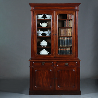 Hoge Franse boekenkast in mahonie, de bovenkant met twee grote beglaasde deuren met oud onregelmatig glas. In de naar voren springende onderkast twee laden en twee deuren. De zijstijlen zijn voorzien van cannelures. Het geheel staand op een strakke dichte plint en onder een uitkragende kroonlijst. De planken zijn eenvoudig verstelbaar.