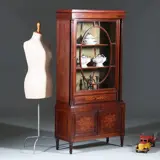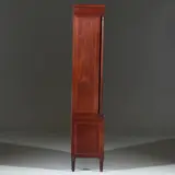 Franse vitrinekast in mahonie met een beglaasde deur met roedeverdeling, daaronder een lade en voorts een naar voren springende onderkast met twee deurtjes, daar achter een schap. Het geheel op 4 kleine gedraaide tapse pootjes met cannelures.