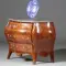 Een commode van ongeveer een eeuw oud, gemaakt naar 18 e eeuwse Parijse voorbeelden. De uitbundige gebombeerde commode is in mahonie belegd met kaders en biezen, daarin geparkeerde vlakken en afwerkt met bronzen beslag en ladentrekkers. Het bovenblad in grijs geaderd marker met een fraai profiel.
