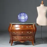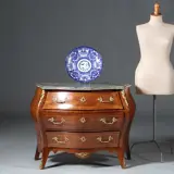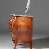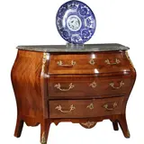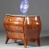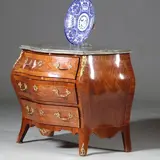 Een commode van ongeveer een eeuw oud, gemaakt naar 18 e eeuwse Parijse voorbeelden. De uitbundige gebombeerde commode is in mahonie belegd met kaders en biezen, daarin geparkeerde vlakken en afwerkt met bronzen beslag en ladentrekkers. Het bovenblad in grijs geaderd marker met een fraai profiel.