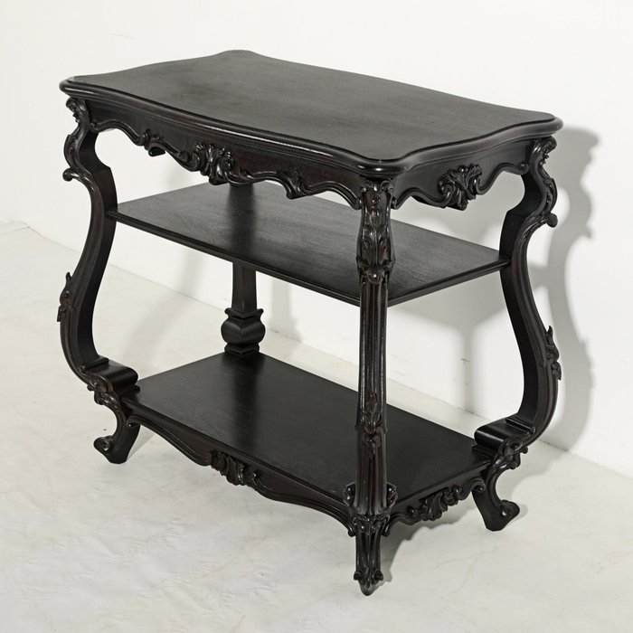 Bijzettafel van houtsnijwerk, draaibaar blad, drie niveaus, dubbele C-poten, afmetingen: 77x84x48 cm. In goede algemene staat.