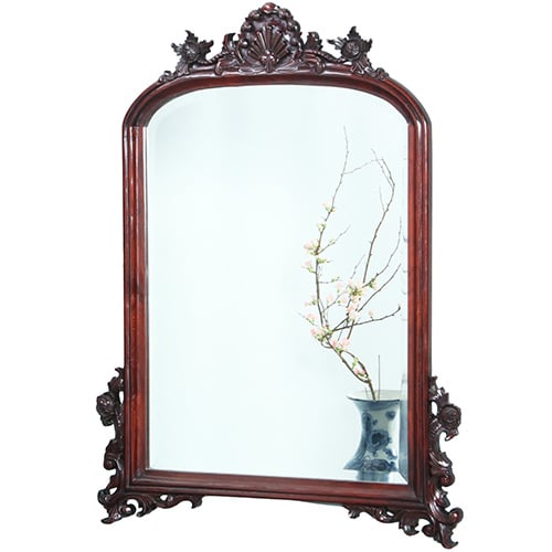 Engelse Victoriaanse mahoniehouten spiegellijst met facetgeslepen getoogde spiegel. De onderhoeken elk met een gestoken ornament van bladeren en krullen. Het geheel bekroond met een fraaie gestoken kuif die voorzichtig begint waar de ronding van de toog eindigen en met behulp krullen, bloemen, bladeren, slingers en rocailles zich omhoog werkt tot een gezellige apotheose.