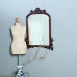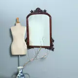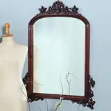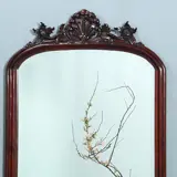 Engelse Victoriaanse mahoniehouten spiegellijst met facetgeslepen getoogde spiegel. De onderhoeken elk met een gestoken ornament van bladeren en krullen. Het geheel bekroond met een fraaie gestoken kuif die voorzichtig begint waar de ronding van de toog eindigen en met behulp krullen, bloemen, bladeren, slingers en rocailles zich omhoog werkt tot een gezellige apotheose.
