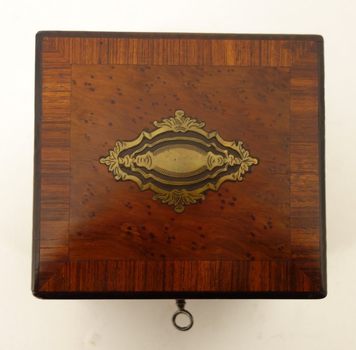 Parfum- of geurkelderdoos in hout en inlegwerk van vergrootglas en messing inclusief 4 Baccarat-kristallen flessen Napoleon III 19e eeuw