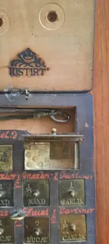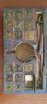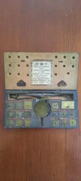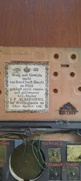 Stalen evenwichtsbalk met zwanenhalsophanging, 2 messing schalen.Met toebehoren: 16 messing gewichten met klein handvat en opschrift, alsmede 3 kleine contragewichten in koffer met opschrift.In donker gebeitste houten koffer met mooi bewaard gebleven label, gedateerd 1781, aan de binnenkant van het deksel tussen twee merk markeert "Justirt".Nominale aanduiding in rood boven de pits, met oud patina.Deksel met gegraveerde messing gespen.tekenen van slijtage.18e eeuw 2,3 x 17,5 x 9,3 cm.