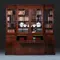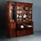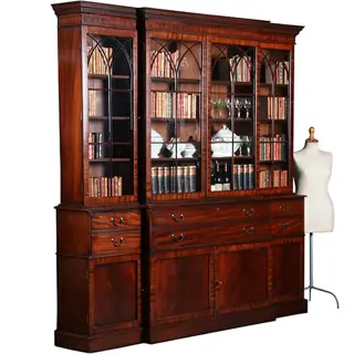 Engelse boekenkast met een zogenaamd breakront, voorzien van 8 deuren, de bovenste 4 met glas, in de onderkast ogenschijnlijk 6 laden, de middelste twee vormen echter het neerklapbare front van een ruim bemeten schrijfbureau. De buitenste laden zijn dubbel uitgevoerd als hoge diepe laden.