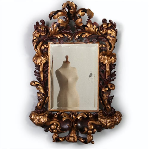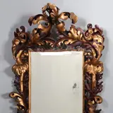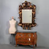Een museale indrukwekkende, uit hout gesneden Italiaanse barok spiegellijst, verguld en deels gebruineerd. De lijst heeft een prachtig volumineus karakter en de bladvormen slingeren, buigen, rollen en duikelen over- en langs elkaar heen, daarmee ruimtes en dieptes creërend, die door de gebruineerde accenten bijna werkelijk in beweging lijken te zijn en niet langer stil staan.