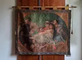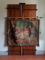 Grote banier op stof, beschilderd met grassap met een scène uit "Aesop's Fables"
