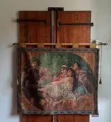 Het is in goede algemene staat, met normale en lichte tekenen van veroudering. Er zijn enkele delen met losse naden (zie laatste foto's). Het stokje om het op te hangen is later vervangen