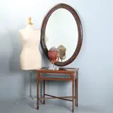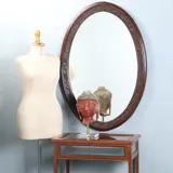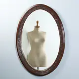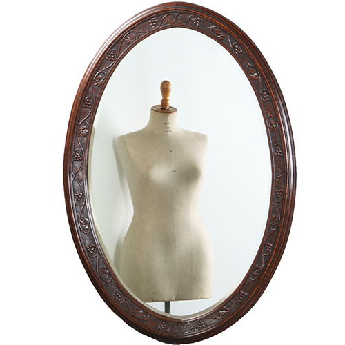 Ovale eikenhouten schouwspiegel met geprofileerde en verdiepte lijst en het spiegelglas met een fraai geslepen facetrand. In de bijna mahoniekleurige eikenhouten lijst is een verdiepte band waarin een slingerende druivenrank is gebeeldhouwd. Fijne slingerende blaadjes en takjes met telkens een klein trosje druiven.