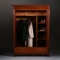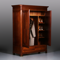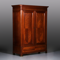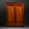 Duitse notenhouten tweedeurs garderobekast met prachtig gespiegelde deurpanelen in een dubbel kwartiers-patroon, met aan de binnenzijde een verglijkbaar patroon. Achter de deuren een indeling als garderobe, een brede roede over ver hele breedte van de kast is natuurlijk ook mogelijk.