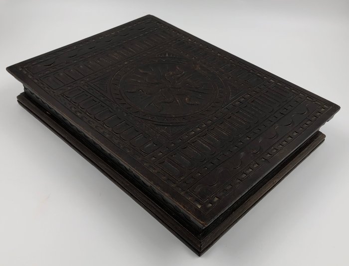 Kostbare en originele prachtig uitgesneden houten kist. Metalen scharnieren, sluit perfect. De sleutel ontbreekt. Goede staat voor zijn leeftijd, enkele kleine deukjes met gebruikssporen. Zie de foto's om een beter idee te krijgen van de details die deel uitmaken van de beschrijving.