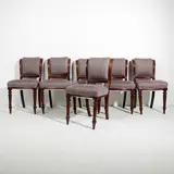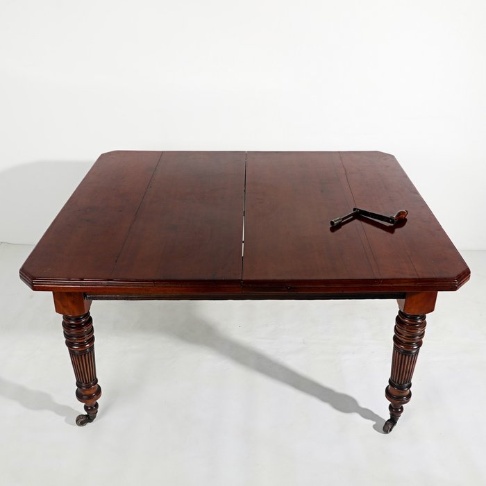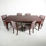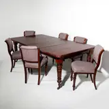 Eettafel, romantische stijl, in fijn hout, gecanneleerde poten, bronzen wielen, twee verlengbladen, metalen zwengel. Stoelen met rugleuningen en zittingen bekleed met stof (bekleding later gerenoveerd, met behoud van de oorspronkelijke stijl), gebeeldhouwde ribbelversiering. Tafel: 77x120x141 cm (gesloten). Verlengblad: 120x46,5 cm (per stuk). Stoel: 87x49x49 cm (per stuk). In goede staat.