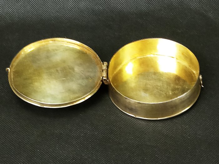 Mooie sacrale doos verguld zilver geen markeringen getest met zuur voor zilver met een positief resultaat goede staat versleten vergulding staat te zien op de foto's die deel uitmaken van de beschrijving.