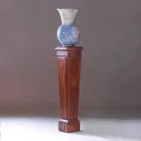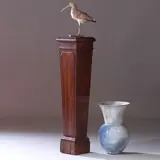 Vierkante zuil of pedestal in massief eikenhout en daardoor zeer zwaar. Mooi doorleefde uitstraling, het blad met vier ingelegde zwaluwstaarten waarmee de drie massieve delen gemonteerd zijn,