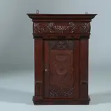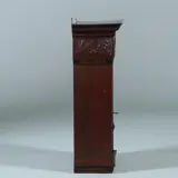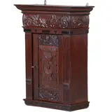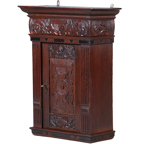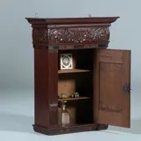 Klein wandkastje uit de 17 e eeuw met aanpassingen en veranderingen van latere eeuwen. De stijlen met cannelures, het middenpaneel met steekwerk, de bolle fries met gestoken kieviten langs een bokaal en bladmotieven. Op de regel daaronder motieven van ebbenhout.