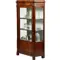 Mahonie met bloemmahonie ééndeurs-vitrinekast met ronde hoekstijlen en staand op gedraaide blokpoten aan de voorzijde. In de kroonlijst een vrijwel onzichtbare lade. Met drie schappen achter glas en daaronder nog een gesloten gedeelte. Prachtig oud glas met aan de voorzijde en zijkanten met een roedeverdeling. De 9 ruitjes geef een goed zicht op de gepresenteerde inhoud van deze vitrinekast.
