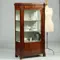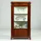 Mahonie met bloemmahonie ééndeurs-vitrinekast met ronde hoekstijlen en staand op gedraaide blokpoten aan de voorzijde. In de kroonlijst een vrijwel onzichtbare lade. Met drie schappen achter glas en daaronder nog een gesloten gedeelte. Prachtig oud glas met aan de voorzijde en zijkanten met een roedeverdeling. De 9 ruitjes geef een goed zicht op de gepresenteerde inhoud van deze vitrinekast.